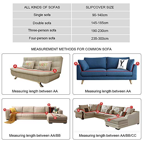 Taille applicable: (env.) Housse de canapé 1 place adaptée à la longueur du canapé 90-140cm, Housse de canapé 2 places adaptée à la longueur du canapé 145-185cm, Housse de canapé 3 places adaptée à la longueur du canapé 195-230cm, Housse de canapé 4 places adaptée à la longueur du canapé 235-300cm. La taille de la taie d’oreiller est de 45 * 45CM. Veuillez mesurer la taille du canapé avant de l’acheter.