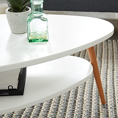 STONE Table basse ovale – Structure en MDF – Revêtement blanc laqué mat – Style et design scandinave – 1 étagère – Pieds en bois hêtre massif – Dimensions : L90 x P60 x H40 cm.